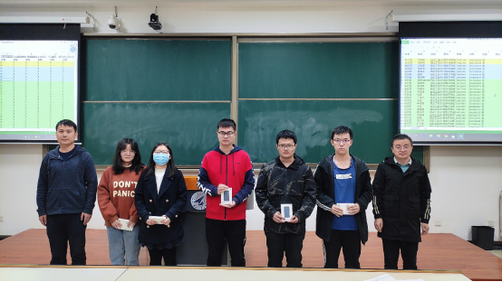 经过30分钟的认真作答,参赛同志都提交了自己的试卷。微电子本科二支部支委通过整理“微助教”后台成绩数据,评定出一等奖2名,二等奖5名,三等奖26名。随后,支部书记李伟同志和黄佛保同志为获奖同志颁发奖品并合影留念。