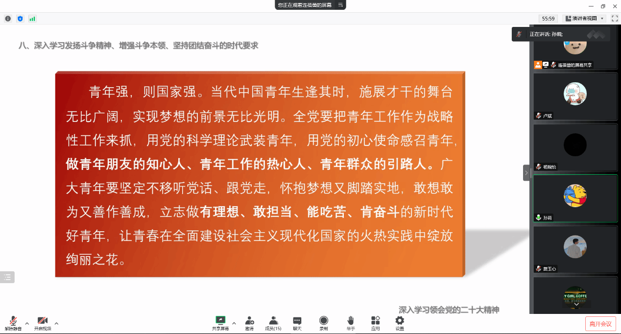 2022年11月11日上午,太阳成集团tyc122ccvip太仓师生联合党支部举办深入学习领会党的二十大精神专题党课,深入学习领会党的二十大精神。本次会议由支部副书记连蓓蕾主持,全体党员同志按时参加。