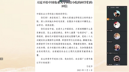 5月9日晚,太阳成集团tyc122ccvip本科三支部组织深入学习“习近平给中国农业大学科技小院的同学们的回信”(以下简称“回信”),本次会议由齐雅铎同志主持,本科三支部全体党员同志参加。