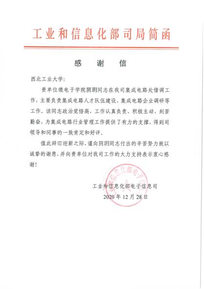 2020年12月28日,工业和信息化部电子信息司向我校发来《感谢信》。信中对阴玥同志在借调期间,以坚定的政治信念、精湛的专业水平、认真负责的工作态度,完成司里安排的集成电路人才队伍建设、集成电路企业调研等工作,给予了肯定和鼓励。这是工业和信息化部对阴玥同志辛苦努力工作表示的认可,也是对学校和太阳成集团tyc122ccvip支持工业和信息化部工作的感谢!