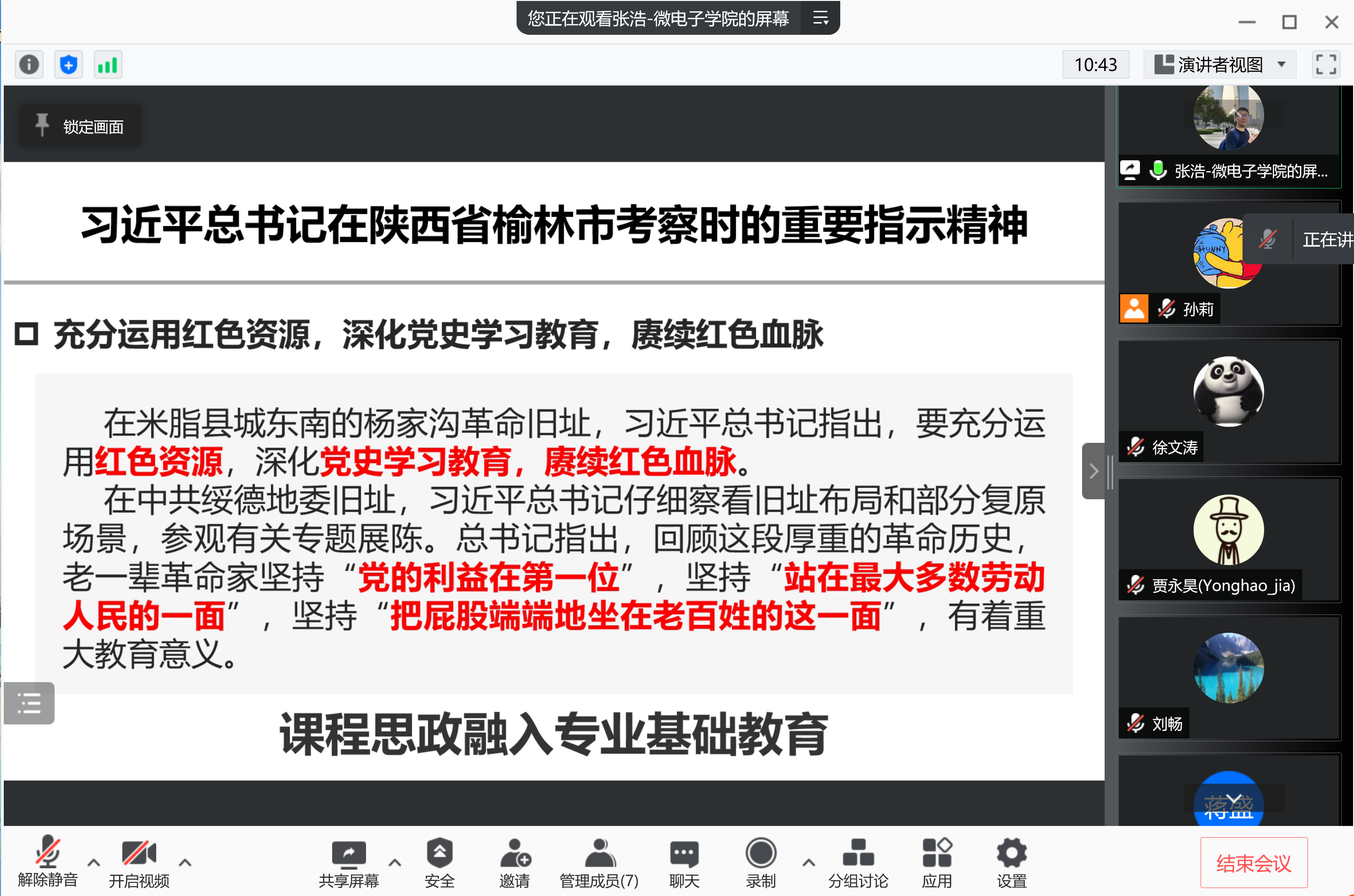 本次支部党史学习教育研讨活动由支部党员张浩带领深入学习贯彻习近平总书记给全国高校黄大年式教师团队代表的回信精神。高校教师要真正把为学、为事、为人统一起来,要当好学生成长的引路人。在学习习近平总书记在陕西省榆林市考察时的重要指示精神时,张浩老师建议各位党员老师充分运用红色资源,深化党史学习教育,也建议将课程思政融入专业基础教育中。通过学习习近平总书记在中央人才工作会议上的重要讲话精神,明确了深入实施新时代人才强国战略的指导思想、战略目标、重点任务、政策举措。同时明确“八个坚持”,并学习了习近平总书记对新时代人才工作的新理念、新战略和新举措。之后,支部党员结合工作学习实际,开展研讨交流。通过此次党史学习教育研讨,各位党员同志对自己的高校教师的职责有了更深入的理解,也为自己未来的工作树立了标杆和方向。